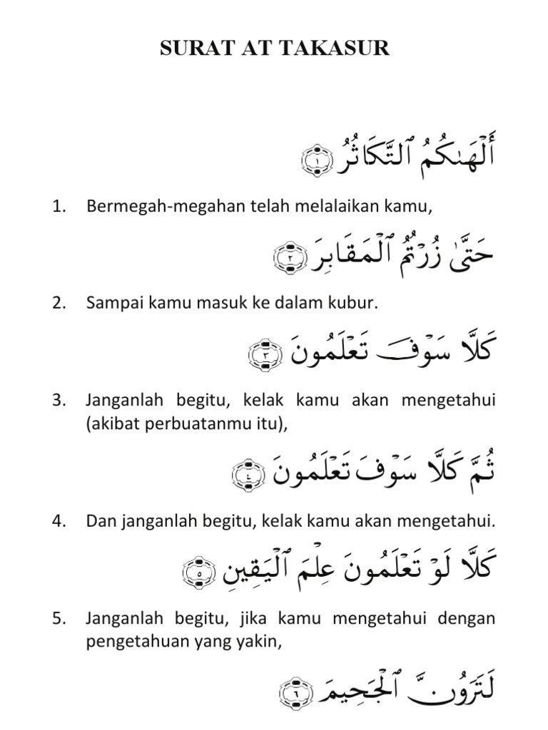 18 april surat at taktsur merdu atau al hakumut takasur dan artinya t. Surat at takasur lengkap arab, terjemah indonesia, dan latin (untuk bantu yang belum lancar arab). Bacaan ayat ayat surat at takasur sangat mudah untuk dihafal melalui audio, seperti mp3 ayat kursi yang bisa sobat download lalu jadikan panduan dalam menghafalnya. Surat at takasur( makkiyah 8 ayat )`>l `.l>`.l alaakumut takaatsur 1. Baca surat at takasur lengkap bacaan arab, latin & terjemah indonesia.